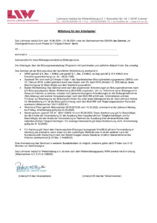 Anerkannt als Bildungsurlaub bzw. anerkannter Bildungsträger für Bildungsurlaub/Bildungszeit in: Baden-Württemberg, Berlin, Brandenburg, Hessen, Niedersachsen, Nordrhein-Westfalen, Rheinland-Pfalz, Saarland, Schleswig-Holstein